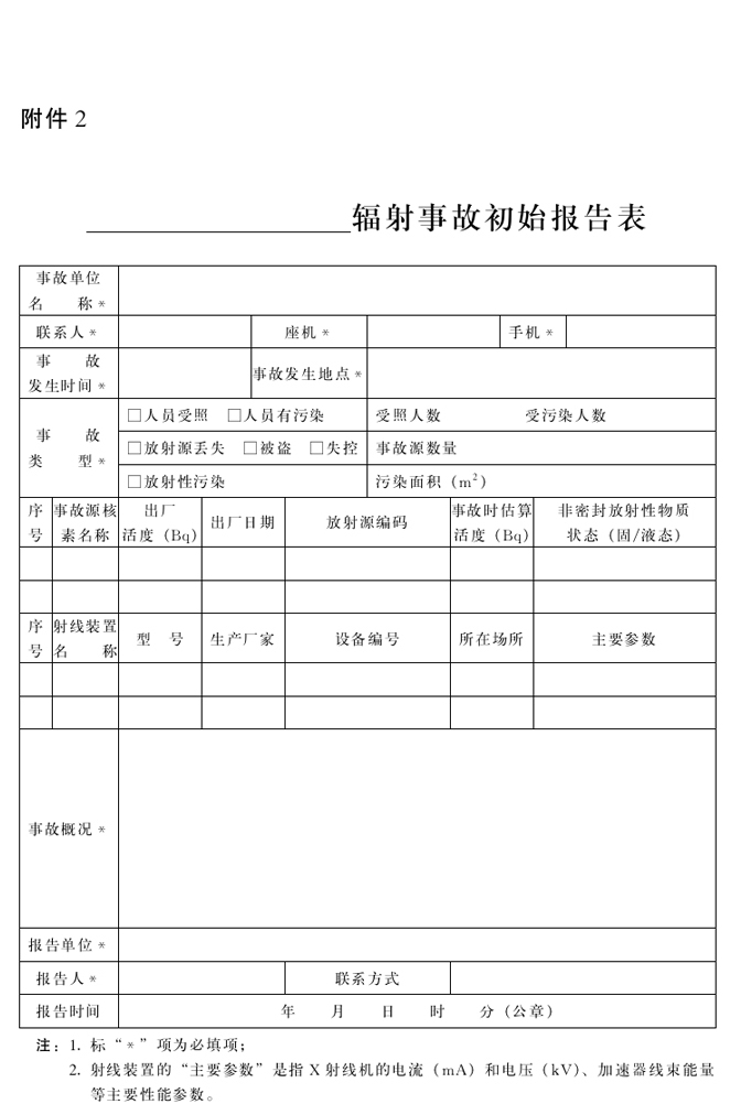 (1)初報采用書面報告的形式(見附件2),緊急時也可用電話直接報告,隨后書面補報。主要內(nèi)容應(yīng)包括:發(fā)生輻射事故的原因、發(fā)生時間、地點、人員受害情況、事件潛在的危害程度等初步情況;