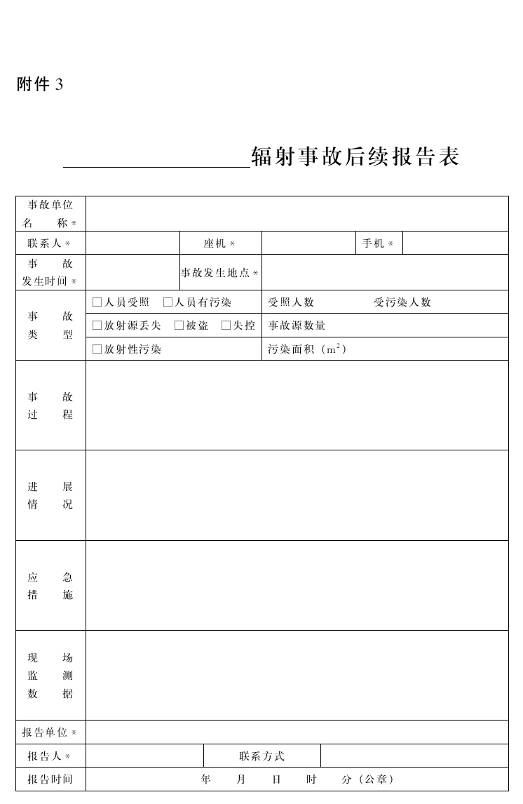 (3)結(jié)果報告采用書面報告,在初報和續(xù)報的基礎(chǔ)上,報告處理事件的措施、過程和結(jié)果,事故潛在或間接的危害、社會影響、處理后的遺留問題,參加處理工作的有關(guān)部門和工作內(nèi)容,出具有關(guān)危害與損失的證明文件等詳細情況,并填寫輻射事故處理結(jié)果報告表(見附件4)。