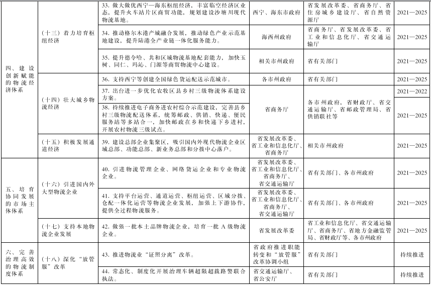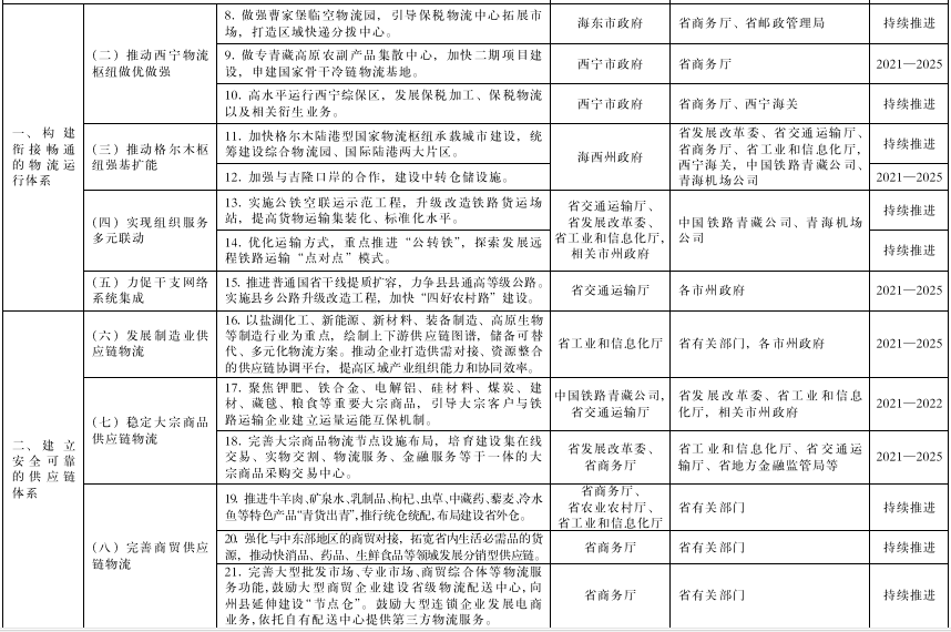 (五)推動西寧物流樞紐做優做強。做優朝陽物流園區,推動建材等大宗商品出城進郊,打造物流大數據中心及城市快消品共同配送中心,積極發展物流總部經濟。有序推進北山建材市場搬遷,規范北川物流集散地功能,建設道路貨運綜合服務驛站。投運青海絲路國際物流城,提升集疏運設施水平,打造區域大宗商品公鐵聯運現代物流樞紐產業基地,有序建設海關監管作業場所。做強曹家堡臨空物流園,引導保稅物流中心拓展市場,引進國內大型物流集團進駐,完善職工宿舍、公共交通等配套服務條件,打造區域快遞分撥中心。做專青藏高原農副產品集散中心,加快二期項目建設,開辟農特產品上行通道,申建國家骨干冷鏈物流基地。高水平運行西寧綜保區,完善保稅物流體系,發展保稅加工、保稅物流及衍生業務,打造對接國際物流窗口。