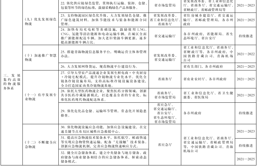 (十四)有序發展專業物流。以服務綠色有機農產品輸出地建設為目標,對接現代農牧、食品加工、生物醫藥等產業,重點針對牛羊肉、乳制品、果蔬、低溫食品、水產品等適冷商品,引導大型農產品流通企業、郵政快遞企業、供銷合作社發展生鮮電商+中央廚房+冷鏈宅配模式和農產品田頭預冷保鮮、低溫分揀、冷藏倉儲等設施,提升冷鏈物流專業化水平。優化全鏈條冷鏈設施布局,建設高標準冷鏈設施,擴大冷鏈運輸設備規模,打造國家肉類冷鏈物流基地。完善醫藥物流配送體系,依托大型醫藥物流企業,創新共享醫藥冷藏箱新模式,打造廣覆蓋、專業化、標準化醫藥現代物流配送體系。打造智慧冷鏈,加強全程溫控和追溯,確保食品藥品質量安全。強化危化品倉儲、運輸環節管理,常態化排查隱患。