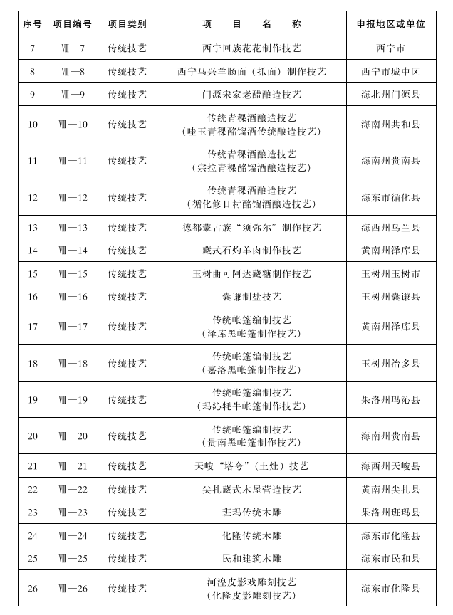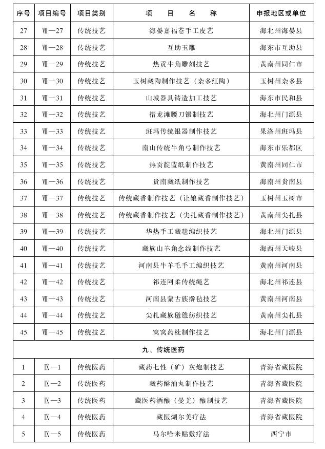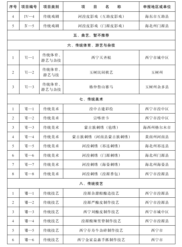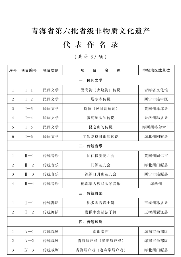 省文化和旅游廳提出的青海省第六批省級非物質文化遺產代表作名錄(共計97項)已經省政府批準,現予公布。